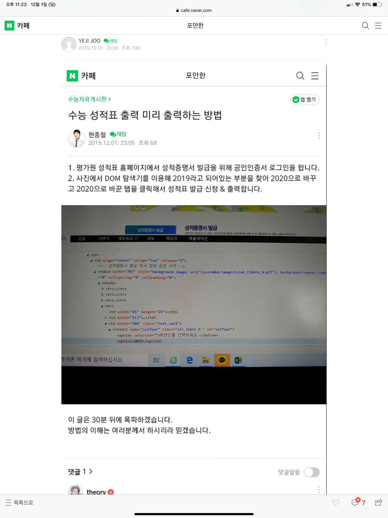 DOM 탐색기를 이용해서 2019라고 되어 있는 부분을 2020으로 바꾼후 성적표 발급 신청& 출력하면