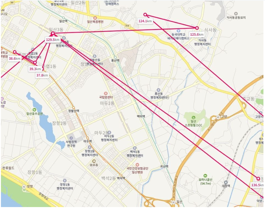 일산 : 롯데마트 / 그랜드백화점 / 일식집 / 분식집 / 렌터카업체 / 모친 집 / 식사동 의류업체 / 식사동 스타벅스