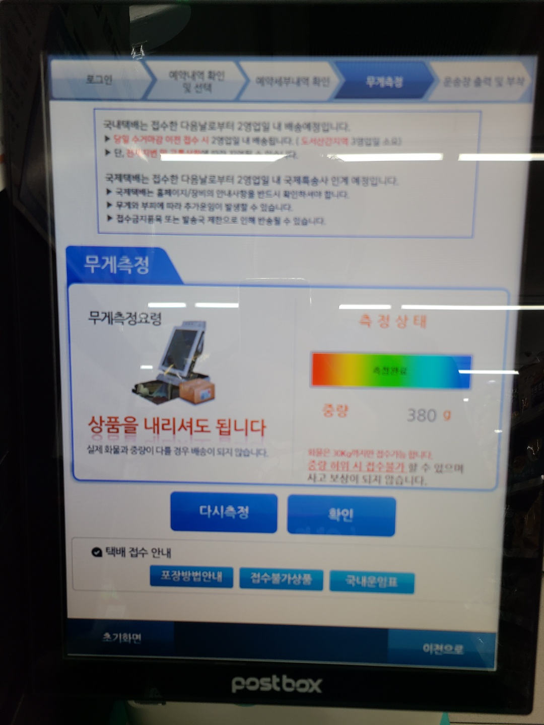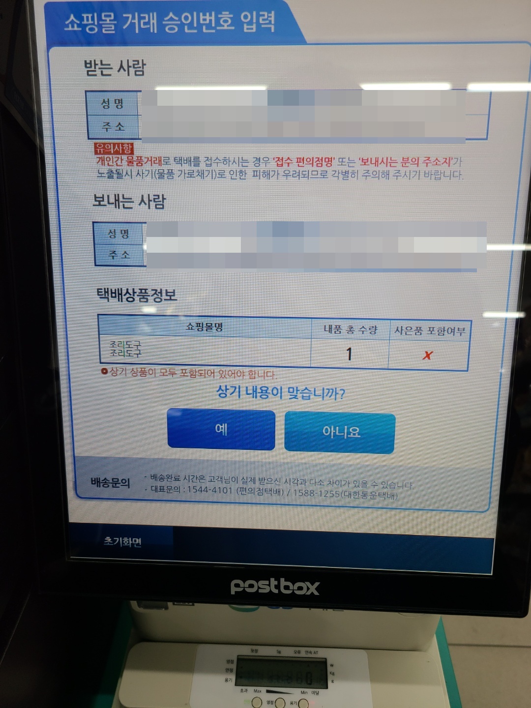 그러면 제가 반품 신청한 정보가 뜨는데 맞는지 확인하고, 무게를 측정합니다.