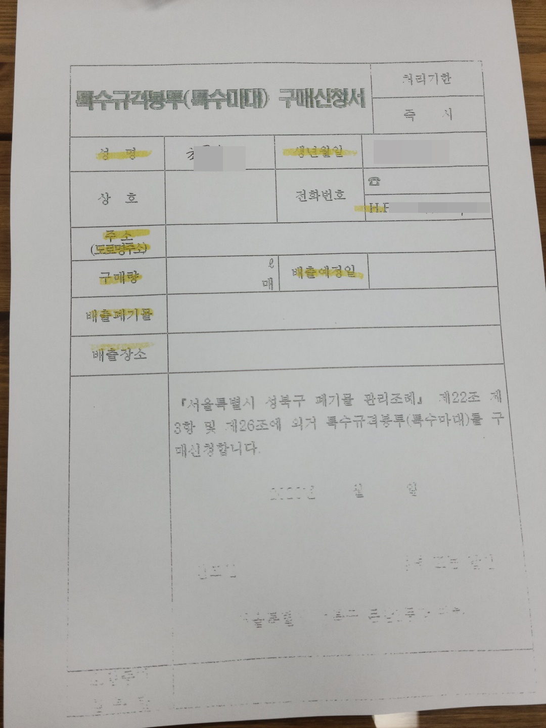 판매를 위해 아래와 같이 구매신청서를 작성하신 후에 마대에 담아서 집앞에 내놓으시면 됩니다.