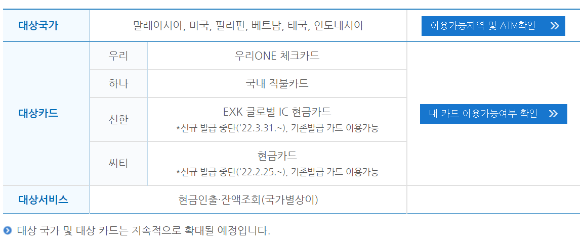 현재 EXK 서비스를 지원하는 카드는 현재 우리ONE 체크카드와 하나 국내직불카드만 가능합니다.
