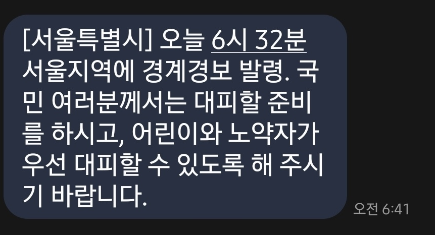 [서울특별시] 오늘 6시 32분 서울지역에 경계경보 발령. 국민 여러분께서는 대피할 준비를 하시고,