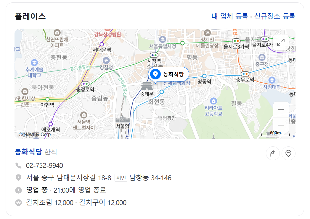 동화식당은 회현역에서 내려서 바로 있는데요. 중구 남대문시장길 18-8번지로 남대문시장 갈치조림 골목에서 찾을 수 있습니다.