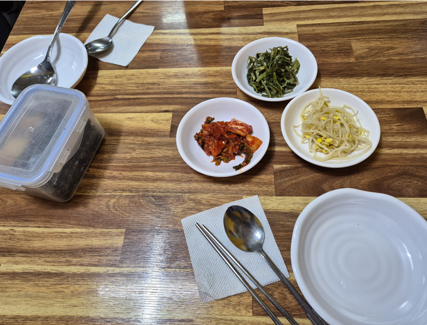 그리고 밑반찬이 나옵니다. 확실히 시장 안에 있어서 자리는 정말 좁구요.
